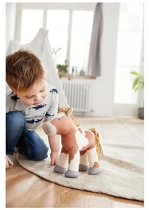 HABA Fohlen Luna. Das niedliche Fohlen erobert die Herzen kleiner Pferdefreunde im Sturm. Körper wattiert, Mähne und Schweif aus Chenille, Füße aus Cord.